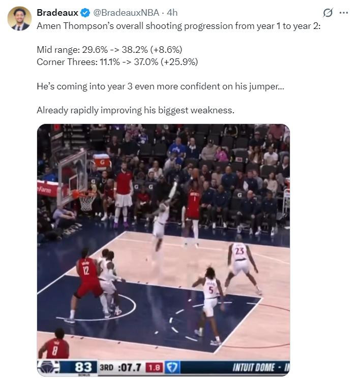 阿门二年级时已经开始让软肋消散,新秀赛季中投命中29.8%,上赛季已经提升到38.2%;新秀赛季底角三分命中率11.1%,而上赛季已经提升到25.9%,阿门的投射进步是对火箭最大的助力,因为空间就更大了。