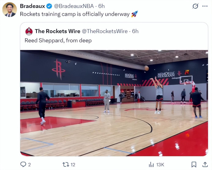 火箭记者Bradeaux晒出了谢泼德合训后的加练,谢泼德连续命中两个超远三分球。虽然上赛季谢泼德的三分球命中率并不高,但他实际上是NCAA历史最伟大的三分手之一,如果新赛季谢泼德能将三分命中率提升到38%,火箭的空间将继续扩大。