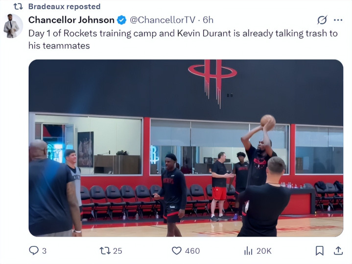 还有火箭记者透露,凯文-杜兰特在训练营的第一天就开始喷垃圾话了,他朝着助教与队友狂喷垃圾话。正如此前亚当斯、布克等人所说的KD对自己人也喷垃圾话。