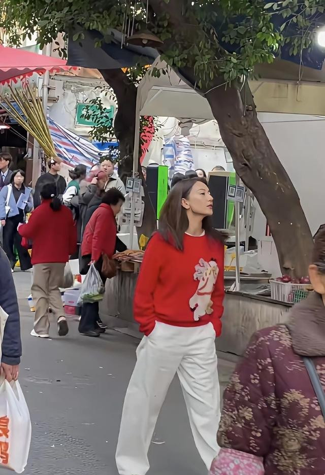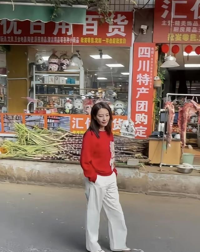 46岁高圆圆现身成都街头拍摄节目, 红色毛衣搭配白色裤子造型封神