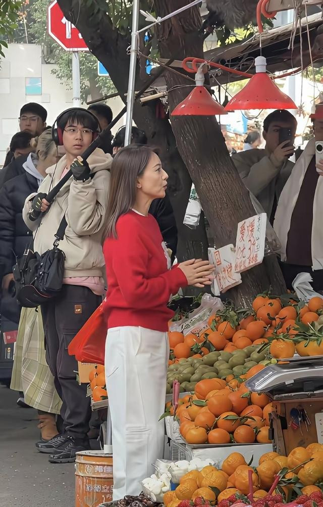 她不是一个人在那儿站着,旁边是个卖水果的摊子。她就跟那个卖水果的大姐聊天,不知道在聊些什么,有说有笑的。一点都没有那种大明星的架子,就跟邻居串门一样,挺随和的。