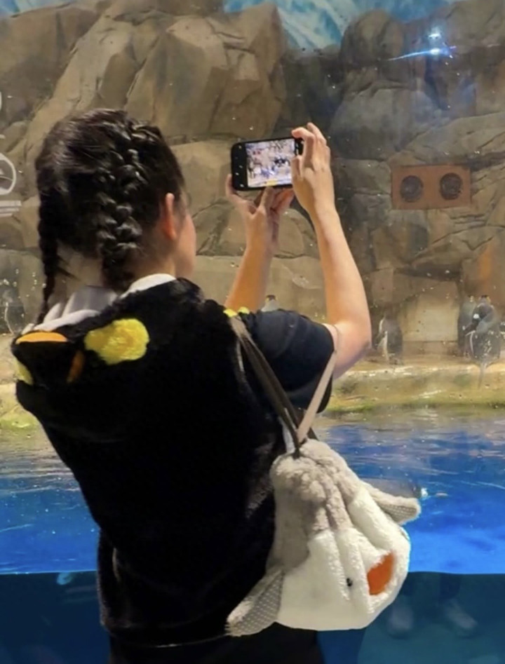 刘秀盈23岁生日选择在海洋公园,那是因为她喜欢海洋公园,喜欢里面的动物,尤其是企鹅、水母,而且在生日的时候,香港人进出海洋公园是免费的,刘秀盈就利用了这个福利到此一游。刘秀盈当然不是第一次去海洋公园,说起来她还是海洋公园的常客,特别钟情水母与企鹅。她在企鹅馆逗留了很久,拍摄了不少企鹅的特写照,就连背的包,戴的帽子都是与企鹅相关的。在她伫立拍摄企鹅的时候,其家人在她身后为她拍了一张特写。只见刘秀盈梳了麻花辫,很认真地在找角度拍企鹅,那姿态仍然像个小女孩。
