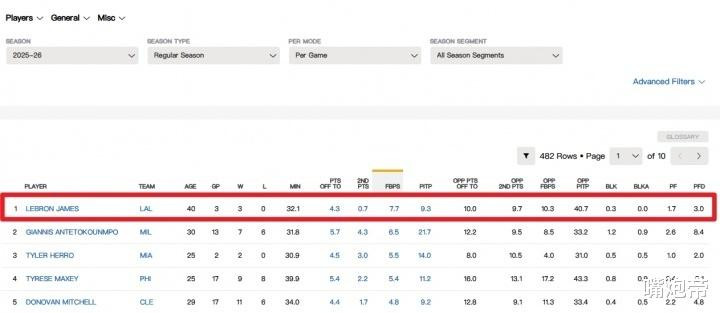 复出三场后, 詹姆斯场均快攻得分7.7分, 反超字母哥来到联盟榜首