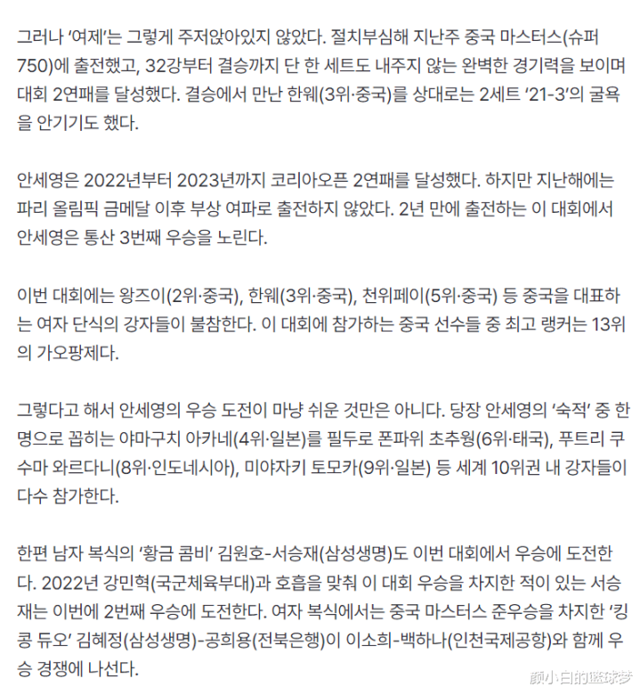文中写道:抱着中国大师赛二连冠的好心情,安洗莹已经回到韩国,羽毛球女帝将在两年后挑战韩国公开赛的冠军。